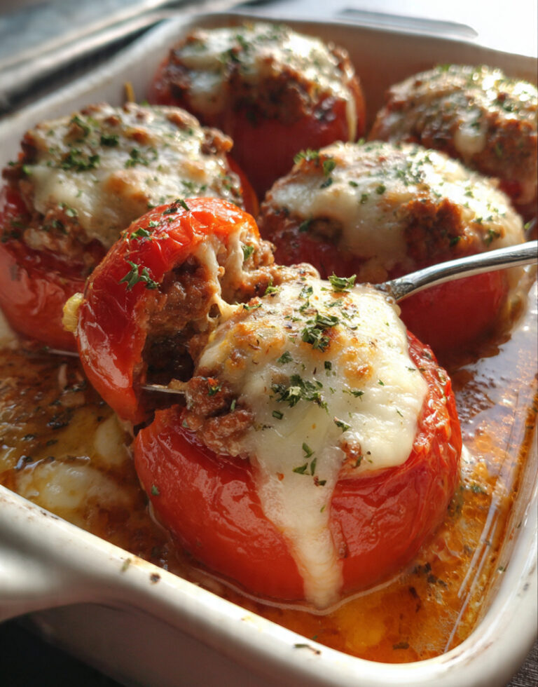 Herzhaft gefüllte Tomaten mit Hackfleisch, Kräutersauce & überbackenem Mozzarella – Der Ofenklassiker neu interpretiert
