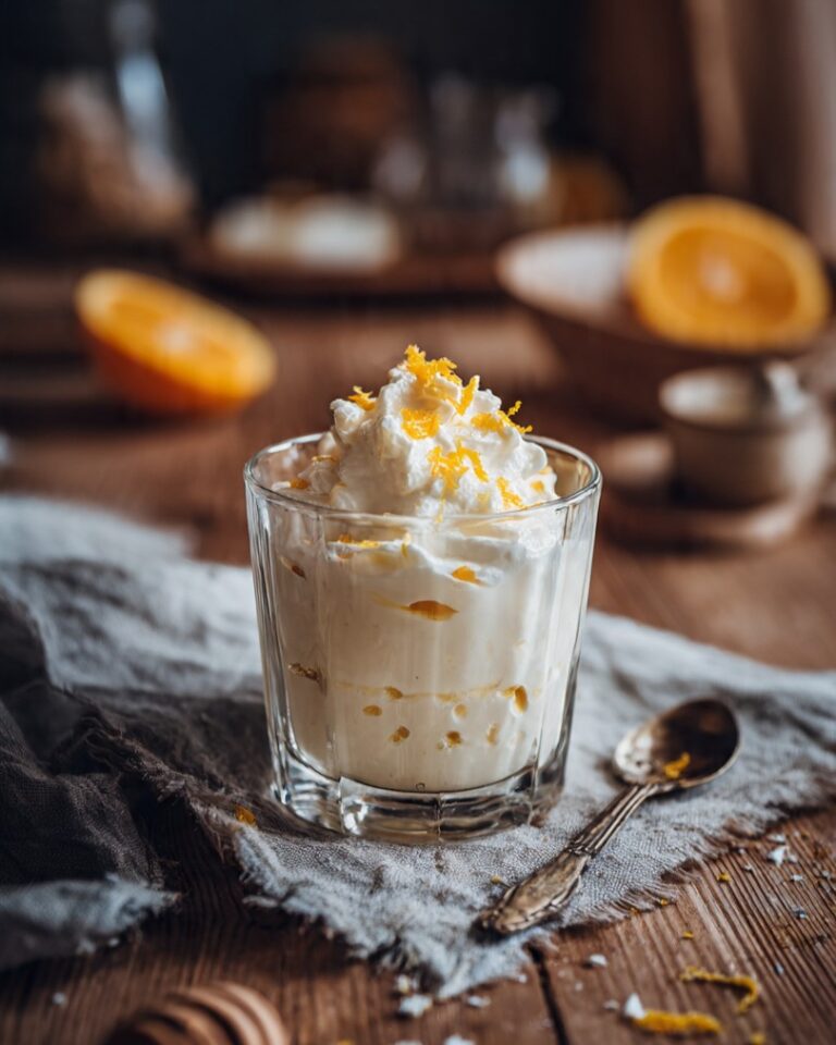 Sanfte Milch-Honig-Creme mit Orangenschale Bewertung: 4,9 von 5 Sternen Diese sanfte Milch-Honig-Creme mit Orangenschale ist ein Dessert von stiller Eleganz und wohltuender Wärme. Das Bild zeigt eine luftig-cremige Konsistenz, fein geschichtet im Glas, gekrönt von einer zarten Haube und bestreut mit frischer Orangenschale. Die Oberfläche wirkt weich und seidig, fast schmelzend, während die helle Farbe…