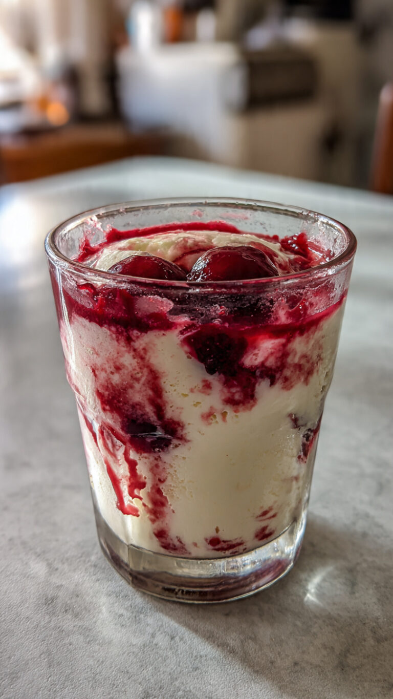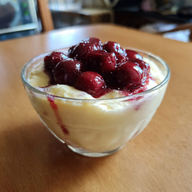 Kirsch-Vanille-Becher wie früher Bewertung: 4,9 von 5 Sternen Der Kirsch-Vanille-Becher ist ein klassisches Dessert aus der Nachkriegs- und Familienküche, das viele sofort an Sonntage, Kaffeetische und einfache Gläser im Küchenschrank erinnert. Das Bild zeigt genau diese Erinnerung: ein schlichtes Glas, darin eine helle, cremige Vanillebasis, durchzogen von dunkelroten Kirschen, leicht verlaufen, nicht perfekt geschichtet, sondern…
