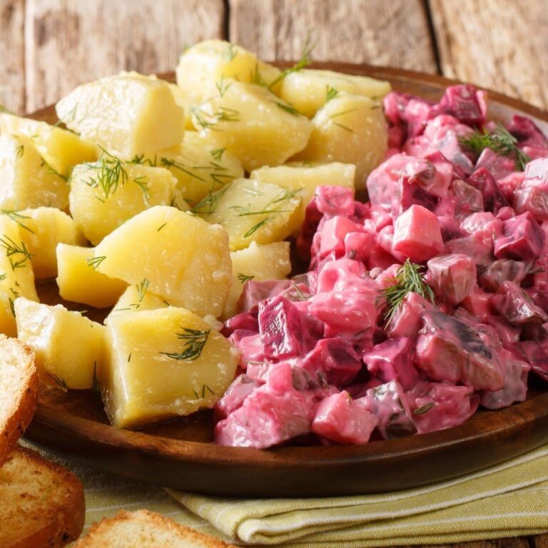 4,8 von 5 Sternen Muttis Kartoffel- und Heringssalat – Herzhaft, cremig und traditionell Einleitung Das Bild zeigt einen klassischen Kartoffel- und Heringssalat, der rustikal auf einem Holzbrett serviert wird. Die Präsentation wirkt bodenständig und authentisch, typisch für traditionelle deutsche Hausmannskost. Links sind grob geschnittene, goldgelbe Kartoffelstücke zu sehen, die mit frischem Dill bestreut sind und…