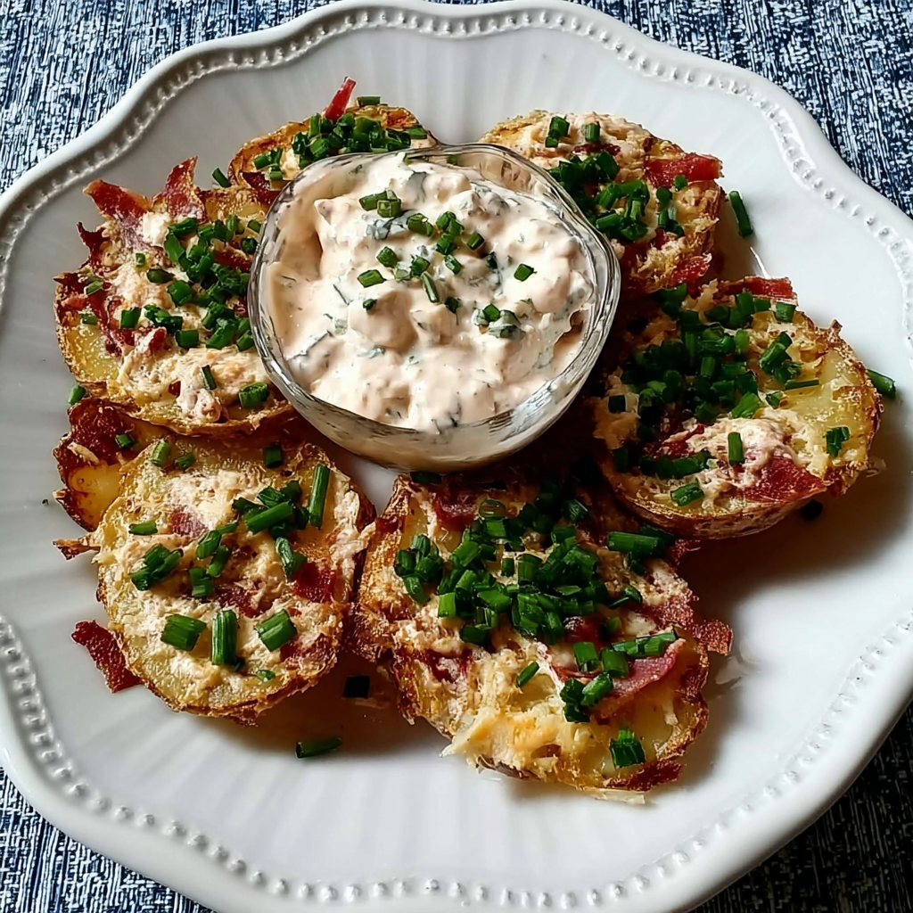 Knusprige Ofenkartoffeln, zerdrückt und mit Öl, Kräutern und Gewürzen verfeinert – dazu ein frischer Dip mit Joghurt oder Quark.