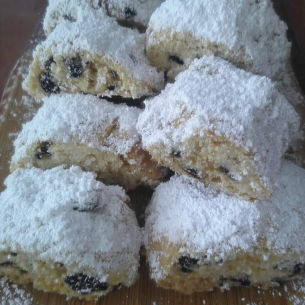 Den Teig zu einer Rolle formen, kleine Stücke abschneiden und zu Würfeln oder Mini-Stollen formen. Auf ein Blech legen und weitere 15 Minuten gehen lassen. Bei 180 °C (Ober-/Unterhitze) ca. 15 Minuten backen.