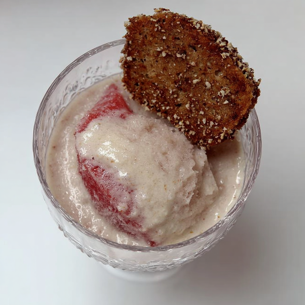 Dieses Wassermelonen-Eis mit veganer Sahne und Haselnuss-Hippe ist ein Dessert, das pure Sommerfrische mit raffiniertem Geschmack vereint. Die leichte Süße der Melone, die zarte Cremigkeit der pflanzlichen Sahne und der goldene Crunch der Haselnuss-Hippe ergeben zusammen ein veganes Kunstwerk – luftig, elegant und einfach köstlich.