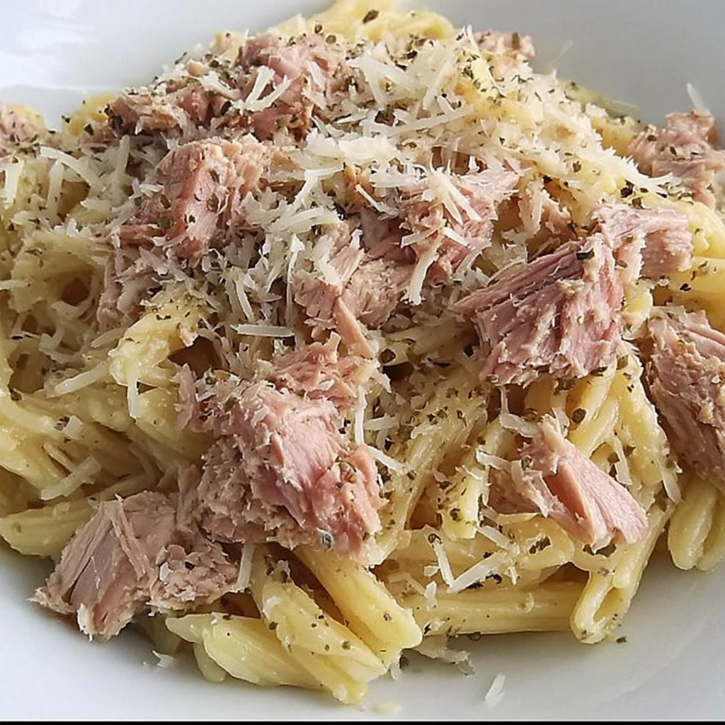 Die Thunfisch-Pasta schmeckt am besten frisch mit etwas geriebenem Parmesan oder Zitronenzesten. Dazu passt ein grüner Salat oder knuspriges Ciabatta.