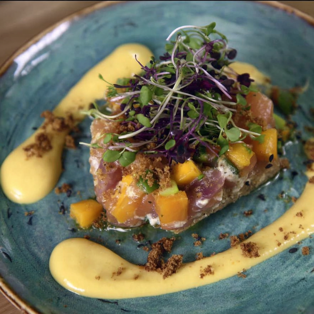 Dieses Lachstatar auf Wasabi-Gurken-Creme und Pumpernickel-Crumble ist ein Spiel aus Texturen und Aromen: samtiges Tatar aus frischem Lachs, cremig-scharfe Gurken-Wasabi-Creme und der knusprige, herzhafte Crunch von geröstetem Pumpernickel. Ein perfekter Auftakt für ein festliches Menü – raffiniert, aber leicht und unglaublich frisch.
