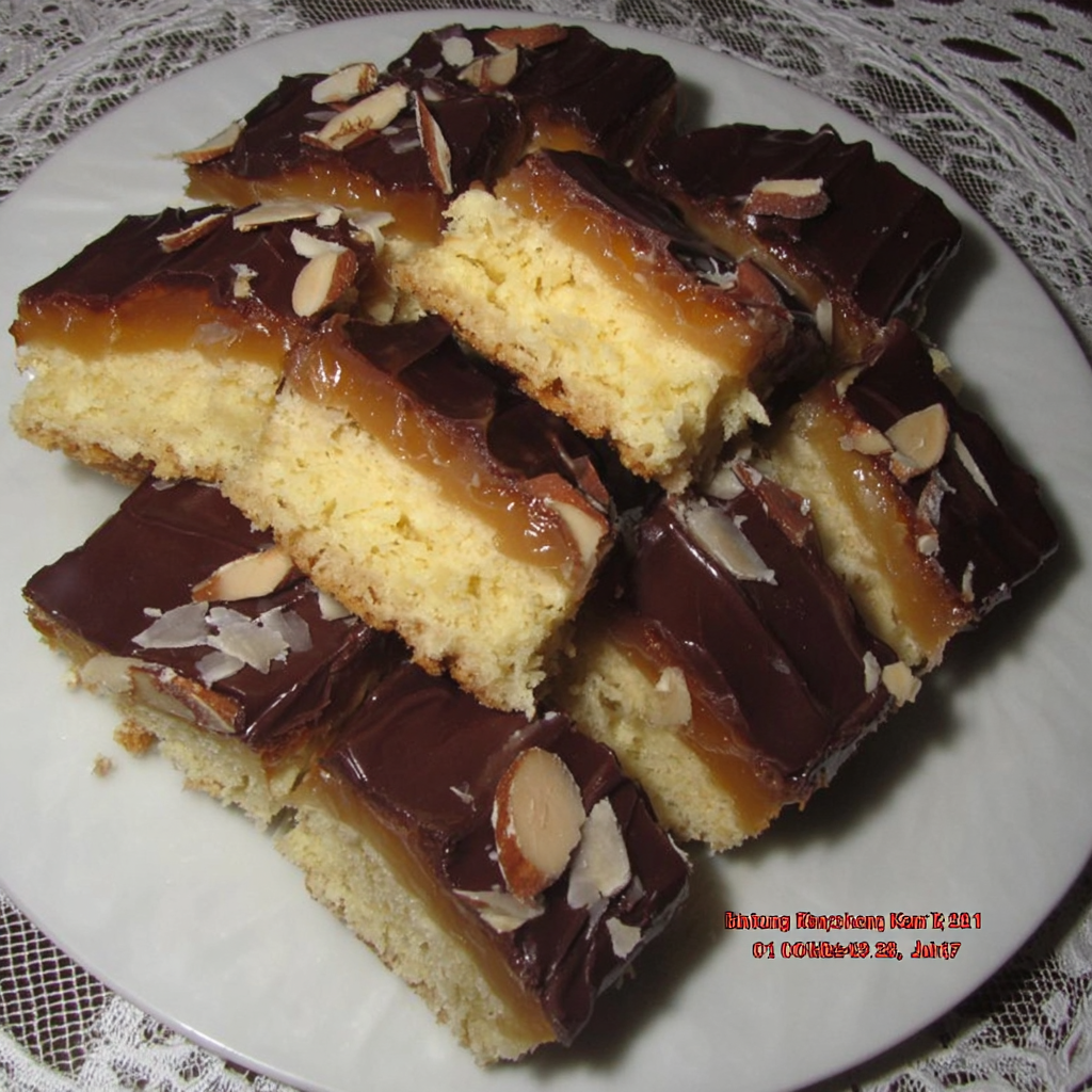 Schokolade und Butter über einem Wasserbad schmelzen, auf der obersten Platte verteilen und glattstreichen. Nach dem Festwerden in Stücke schneiden.