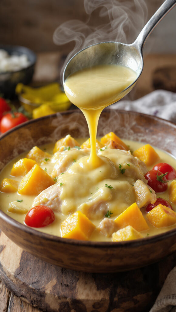 Dieses cremige Hähnchen mit Kürbis ist das perfekte Wohlfühlgericht für den Herbst. Zartes Hähnchenfleisch vereint sich mit aromatischem Kürbis in einer samtigen Sahnesauce – ein Gericht, das wärmt, sättigt und mit seiner goldenen Farbe direkt gute Laune auf den Teller bringt.