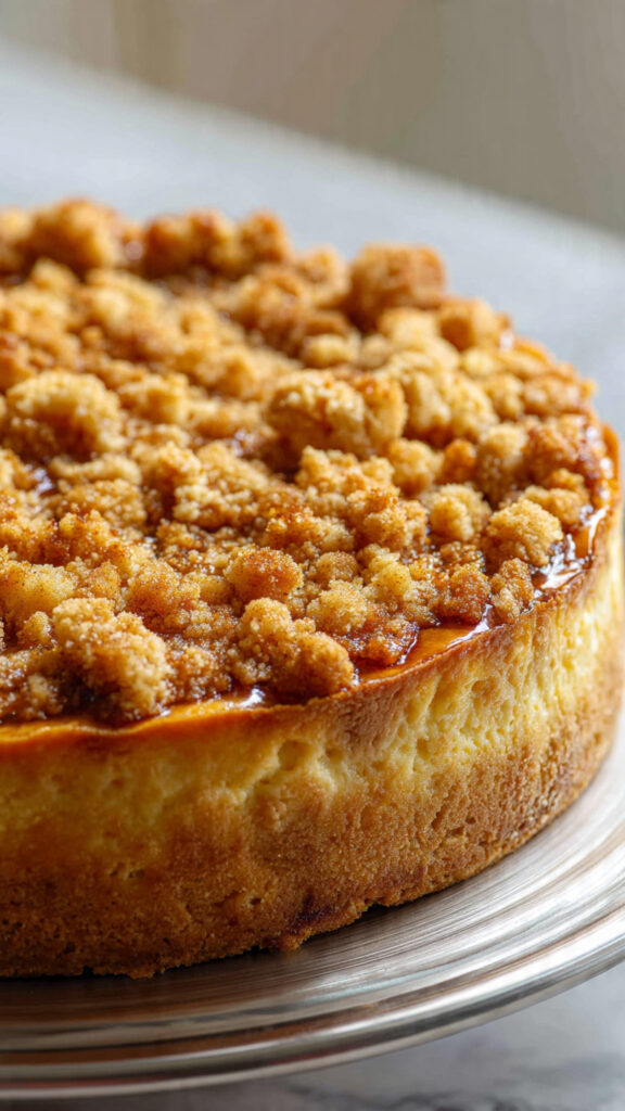 Kuchen nochmals 45–50 Minuten backen, bis die Streusel goldbraun sind und die Creme aufgegangen ist.