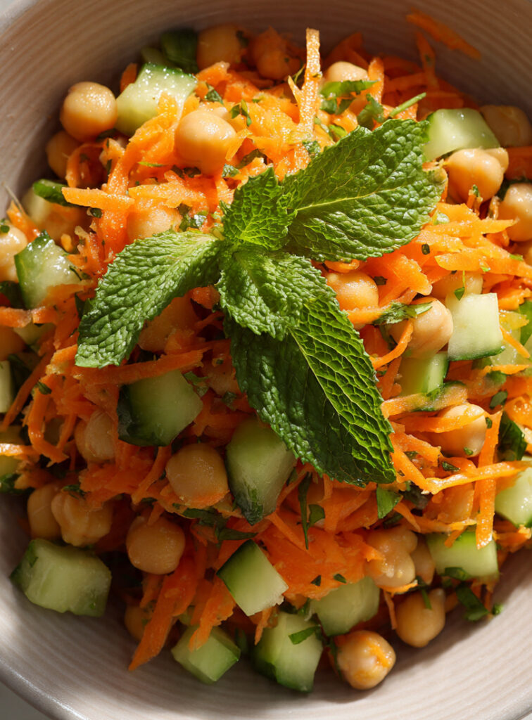 Dieser Möhren-Gurkensalat mit Kichererbsen ist ein erfrischender, bunt gemischter Sommersalat, der in wenigen Minuten zubereitet ist und durch Minze, Zitronensaft und knackiges Gemüse besonders lebendig schmeckt.
