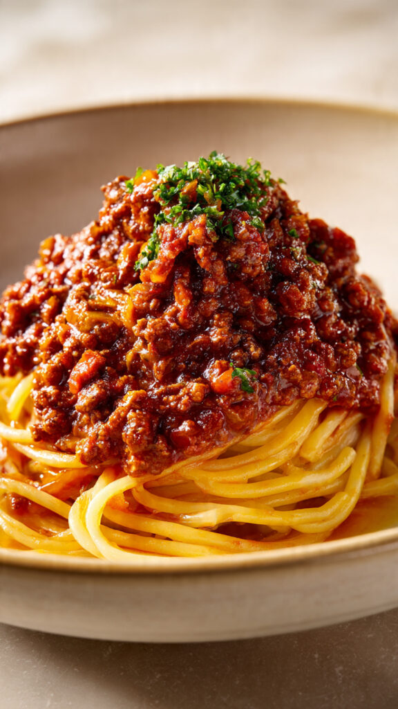 Ein schnelles, herzhaftes Pastagericht, das immer funktioniert: aromatische Tomatensoße, würziges Hackfleisch und perfekt gegarte Spaghetti – simpel, sättigend und voller Geschmack.