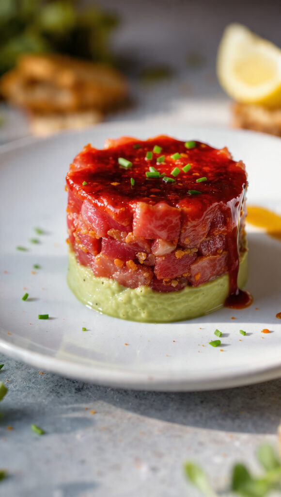 Dieses Tatar kombiniert zarten, fein gewürfelten Thunfisch mit einer seidigen Avocadobasis und einem süß-scharfen Confit aus Chili und Paprika. Die cremige Textur der Avocado steht im Kontrast zur feinen Struktur des Fisches, während das Confit für Wärme, leicht fruchtige Süße und einen aromatischen Akzent sorgt. Als Vorspeise wirkt das Gericht elegant und leicht, ideal für warme Tage oder als stilvoller Einstieg in ein Menü. Entscheidend ist die Frische des Thunfisches, da der Geschmack pur und unverfälscht im Mittelpunkt steht. Durch die Schichtung werden die drei Komponenten zu einem harmonischen Ganzen, das optisch wie geschmacklich beeindruckt.