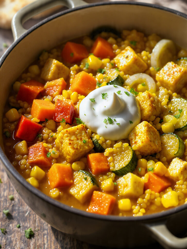 Ein warmer Topf, vollgepackt mit Gemüse, Bulgur und würzig gebratenem Tofu – dieser Curry-Ajvar-Eintopf ist deftig, leicht orientalisch angehaucht und ideal für Tage, an denen etwas Herzhaftes ohne lange Vorbereitung gefragt ist. Bulgur quillt direkt im Topf weich, bindet die Sauce und macht das Gericht angenehm cremig, ohne dass Sahne zwingend nötig ist. Ajvar und Curry geben Tiefe, Steakgewürz Schärfe, und das Gemüse bleibt bissfest, farbig und vielseitig. Dieses Gericht ist mealprep-tauglich, schmeckt frisch, aufgewärmt und sogar am nächsten Tag noch intensiver.