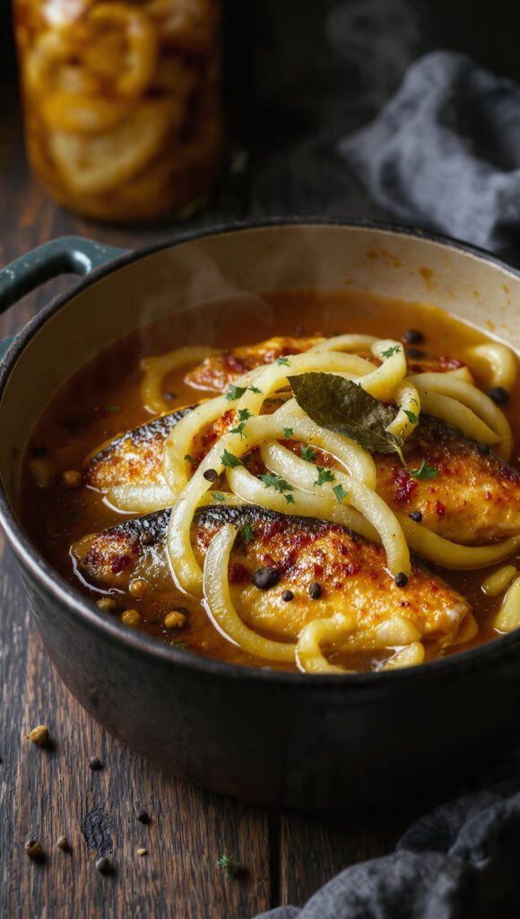 Ein echtes Hausmannskost-Rezept – mild säuerlich, leicht süß, würzig durch Lorbeer, Wacholder und Senfkörner. Die gebratenen Heringe ziehen im Gewürzsud mehrere Tage durch und entwickeln dabei ein tiefes, rundes Aroma. Perfekt zu Bratkartoffeln, Schwarzbrot, Gurkensalat oder einfach direkt aus dem Glas. Die Zwiebeln werden weich und fein, der Sud klar & würzig – klassischer geht’s kaum.
