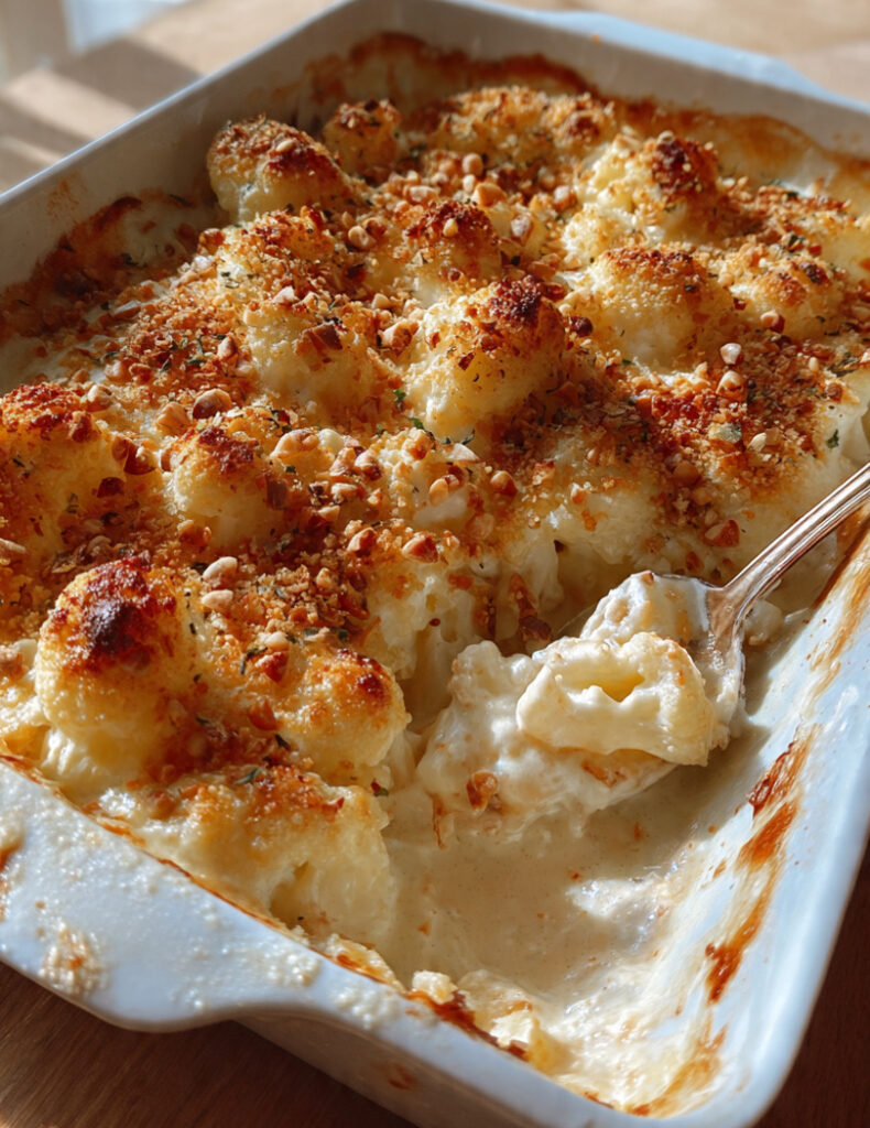 Ein klassisches Wohlfühlgericht, das durch eine aromatische Käse-Béchamel und ein nussig-knuspriges Topping besonders raffiniert schmeckt. Dieses Gratin verbindet cremige, weiche Blumenkohlröschen mit einer seidigen Sauce und einer goldbraunen Kruste – perfekt als Hauptgericht oder elegante Beilage.