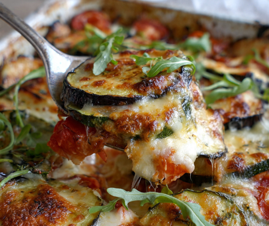 Ein geschichtetes Gratin aus Aubergine, Zucchini, Paprika und Tomaten – kombiniert mit zart schmelzendem Mozzarella, einer würzigen Chili-Tomatensauce und frischem Rucola. Perfekt als vegetarisches Hauptgericht oder aromatische Beilage!