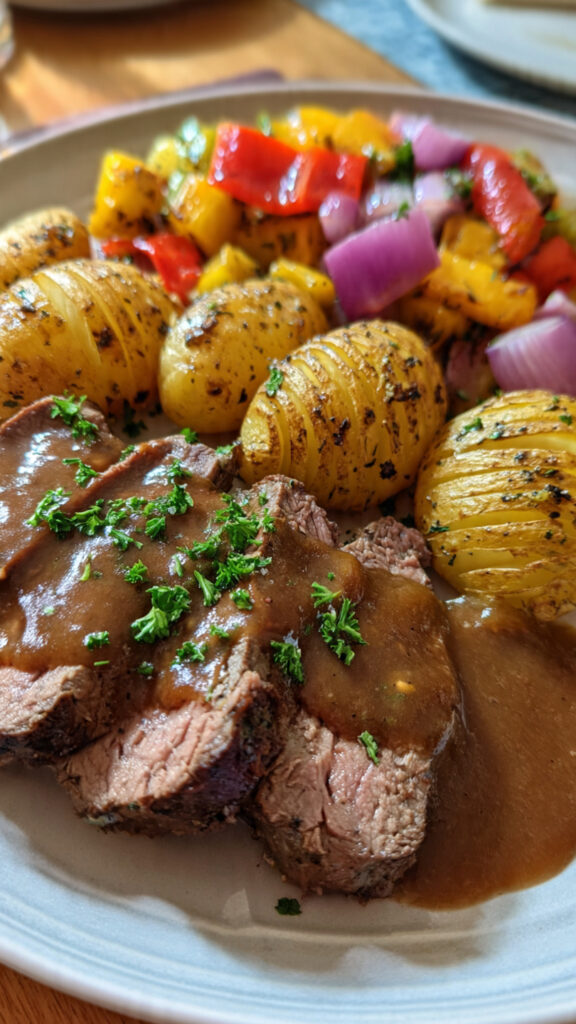 • 🍽️ Lammkeule in Honig-Knoblauch-Soße mit Hasselback-Kartoffeln & Paprika-Gemüse