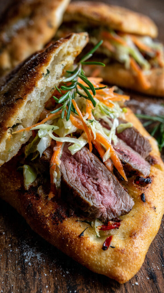 Saftiges Grillfleisch trifft auf knuspriges Kräuterbrot – dazu ein würzig-frischer Krautsalat. Ideal für BBQ, Picknick oder als herzhaftes Streetfood für zuhause.