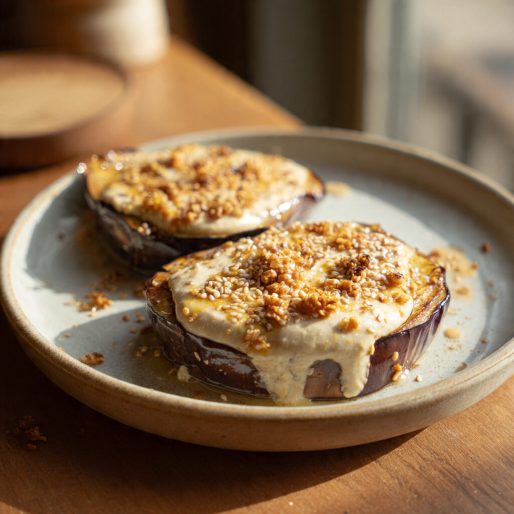 Diese gebackenen Auberginenhälften mit cremiger Zitronen-Tahini-Decke sind ein elegantes Ofengericht, das auf deinem Foto besonders appetitlich zur Geltung kommt. Die Auberginen sind tiefviolett, am Rand leicht karamellisiert und tragen eine dicke, hellgoldene Schicht aus samtiger Tahinicreme. Darüber sind geröstete Sesamkörner und feine Streusel verteilt, die der Oberfläche eine knusprige Textur verleihen. Die Sauce ist sichtbar leicht verlaufen und verbindet sich harmonisch mit dem zarten Fruchtfleisch der Aubergine, wodurch ein saftiges, aromatisches Gesamtbild entsteht.
