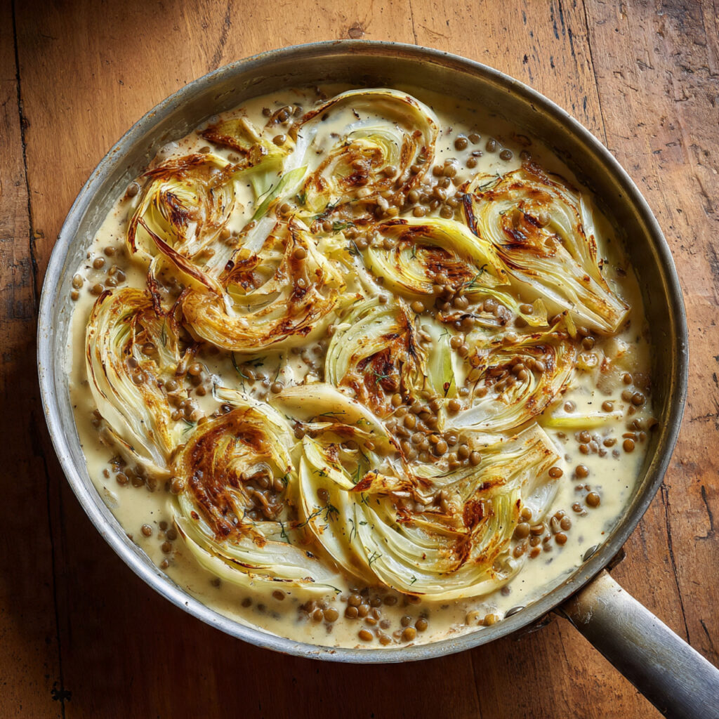 Diese cremige Fenchel-Linsen-Schmelzpfanne steht für eine moderne, entspannte Küche, die mit wenigen Zutaten ein tiefes, ausgewogenes Geschmackserlebnis schafft. Das Bild bringt diese Idee perfekt auf den Punkt: goldene Röstaromen, sanfte Cremigkeit und eine Pfanne, die direkt zum Servieren einlädt.