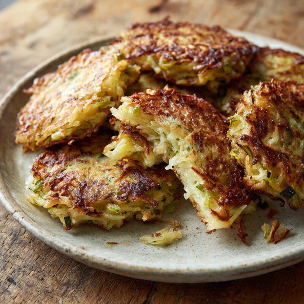 Diese Lauch-Kartoffel-Puffer aus dem Backofen überzeugen bereits optisch durch ihre kräftig goldbraune Oberfläche und die deutlich erkennbare, rustikale Struktur. Auf dem Bild sind die Puffer außen knusprig gebacken, mit gut gebräunten Rändern, während das Innere saftig, weich und locker wirkt. Die feinen Lauchstreifen sind klar sichtbar und sorgen nicht nur für Farbe, sondern auch für eine aromatische Tiefe.
