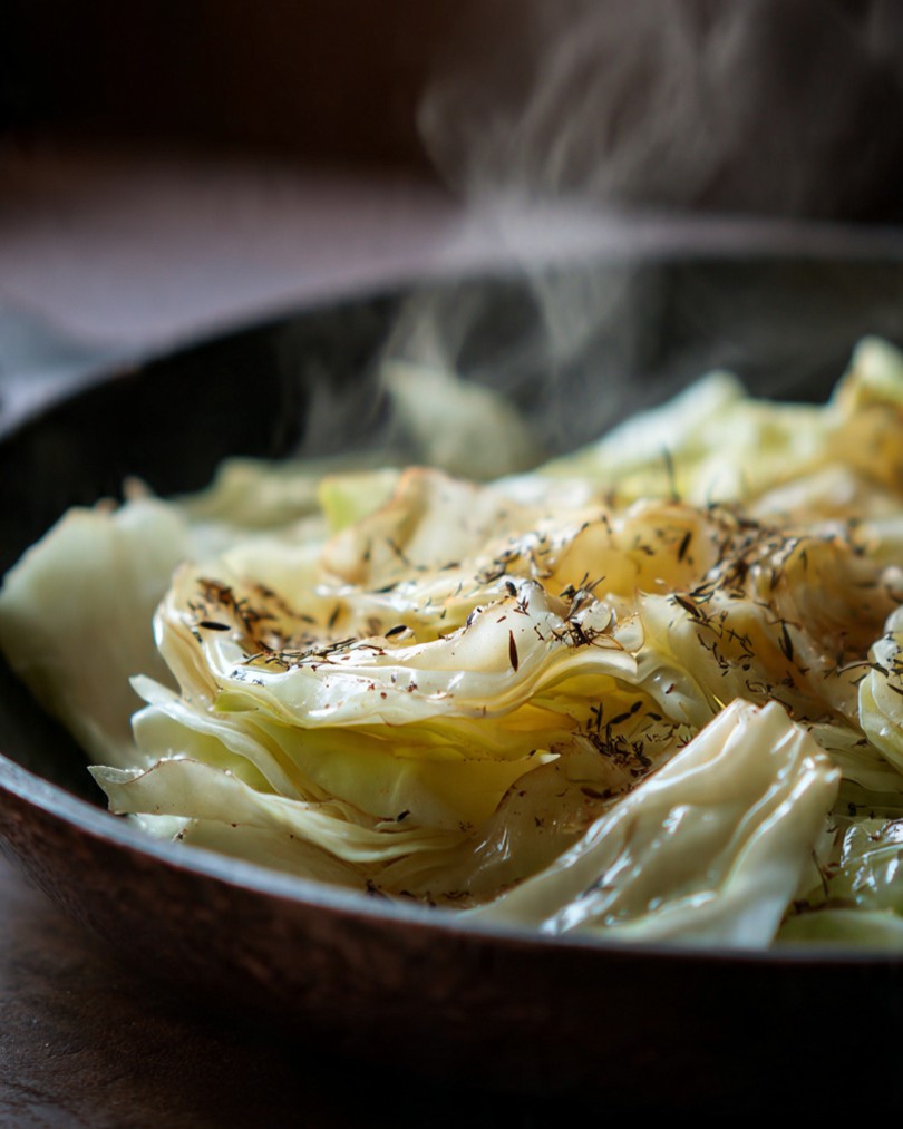 Buttriger Weißkohl mit Kümmel ist ein ruhiges, ehrliches Gericht, das von seiner Schlichtheit lebt. Das Bild unterstreicht diese Atmosphäre perfekt: Dampf, weiche Kohlblätter, dezente Würzung.