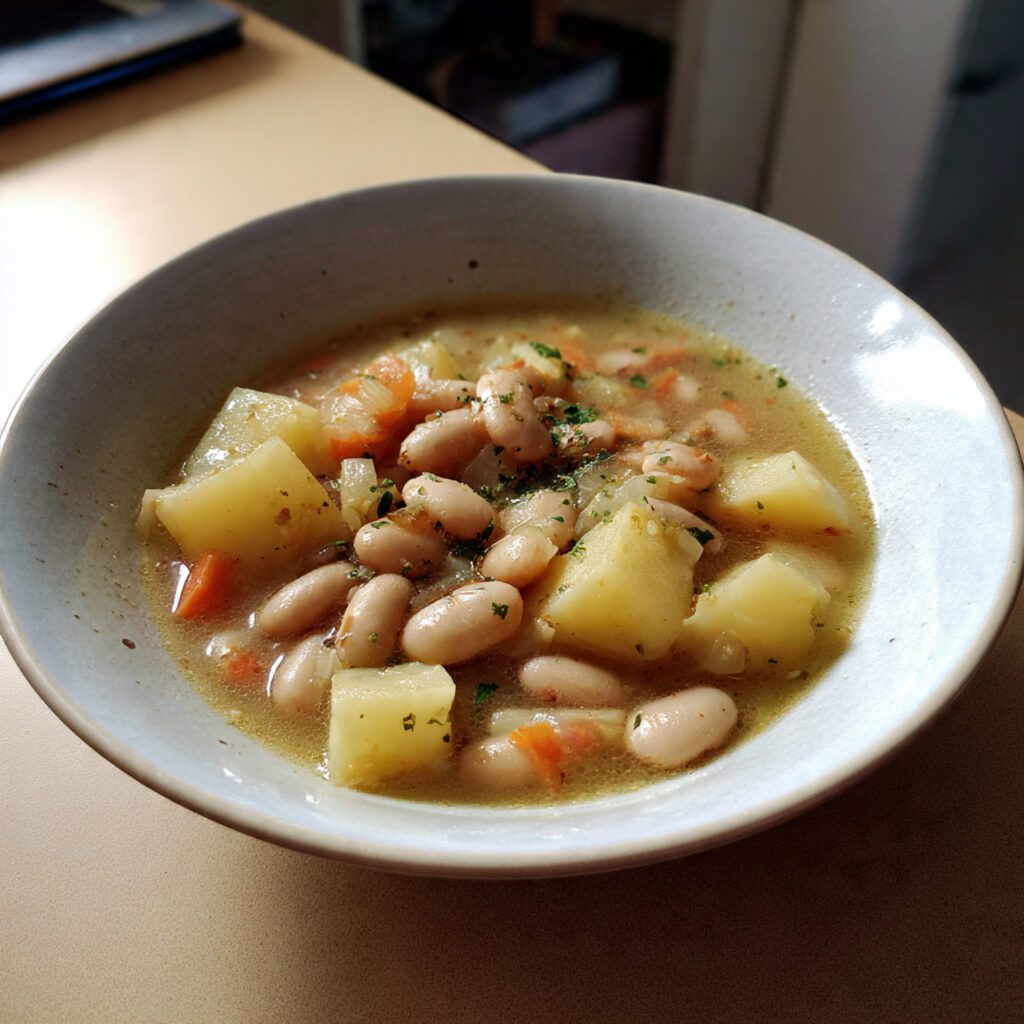 Auf dem Bild erkennt man die harmonische Zusammensetzung der Zutaten: Die weißen Bohnen wirken zart und cremig, die Kartoffelstücke behalten ihre Struktur, und die Brühe umhüllt alles mit einer warmen, goldenen Farbe. Die Textur ist herzhaft, aber nicht schwer – ideal für eine ausgewogene Mahlzeit.
