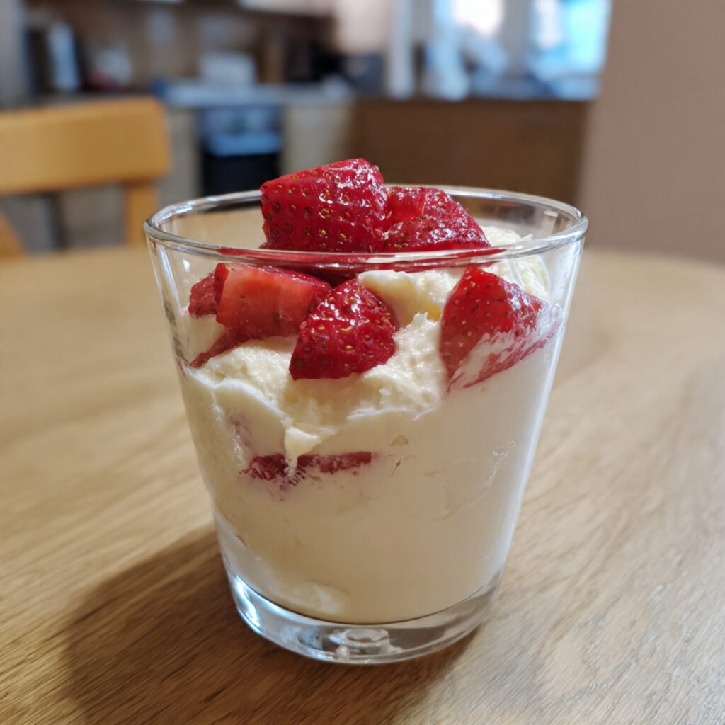 Die Erdbeeren setzen einen intensiven Farbkontrast zur hellen Creme und verleihen dem Dessert optische Frische. Durch das Glas wird die Konsistenz unmittelbar sichtbar: Die Creme ist stabil, nicht fließend, aber dennoch weich – ein Hinweis auf eine gut abgestimmte Bindung und sorgfältige Zubereitung. Kleine Fruchtstücke innerhalb der oberen Cremeschicht lassen erkennen, dass die Erdbeeren nicht nur als Dekoration dienen, sondern bewusst in das Dessert integriert wurden.