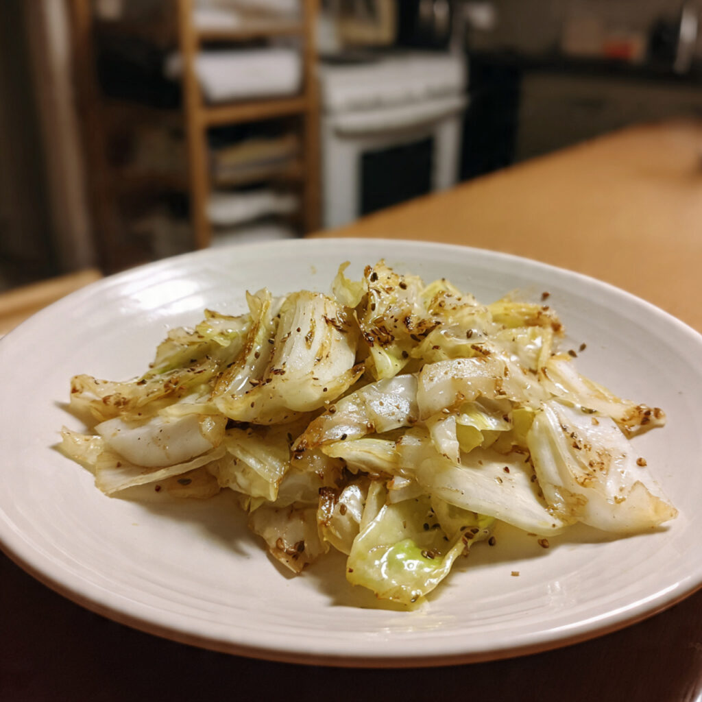 Der auf dem Bild gezeigte gebratene Spitzkohl präsentiert sich in locker geschichteten, leicht gebräunten Blättern, die ihre natürliche Struktur bewahrt haben. Die hellgrünen bis elfenbeinfarbenen Kohlblätter sind sichtbar weich gegart, an den Rändern sanft karamellisiert und mit feinen Kümmelkörnern bestreut, die dem Gericht eine rustikale, bodenständige Anmutung verleihen. Der Glanz auf der Oberfläche deutet auf eine moderate Fettzugabe hin, die den Kohl saftig hält, ohne ihn schwer wirken zu lassen.