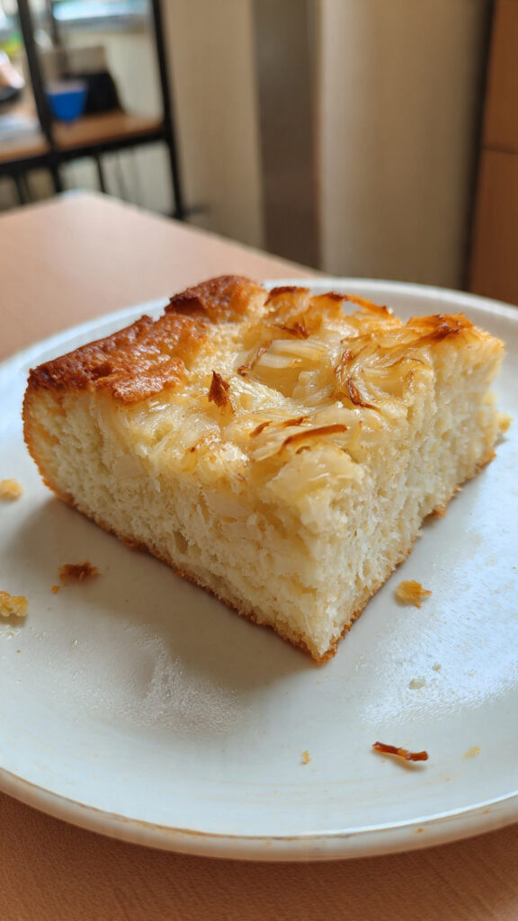 Der Zwiebelkuchen ohne Hefe überzeugt durch eine besonders saftige Textur. Der Boden ist weich, locker und nicht trocken, während der Zwiebelbelag cremig und mild bleibt. Die Zwiebeln sind vollständig gegart, süßlich und keinesfalls scharf. Durch das Backpulver entsteht ein angenehmer, kuchenähnlicher Unterbau, der sich klar von klassischen Hefeteig-Varianten unterscheidet.
