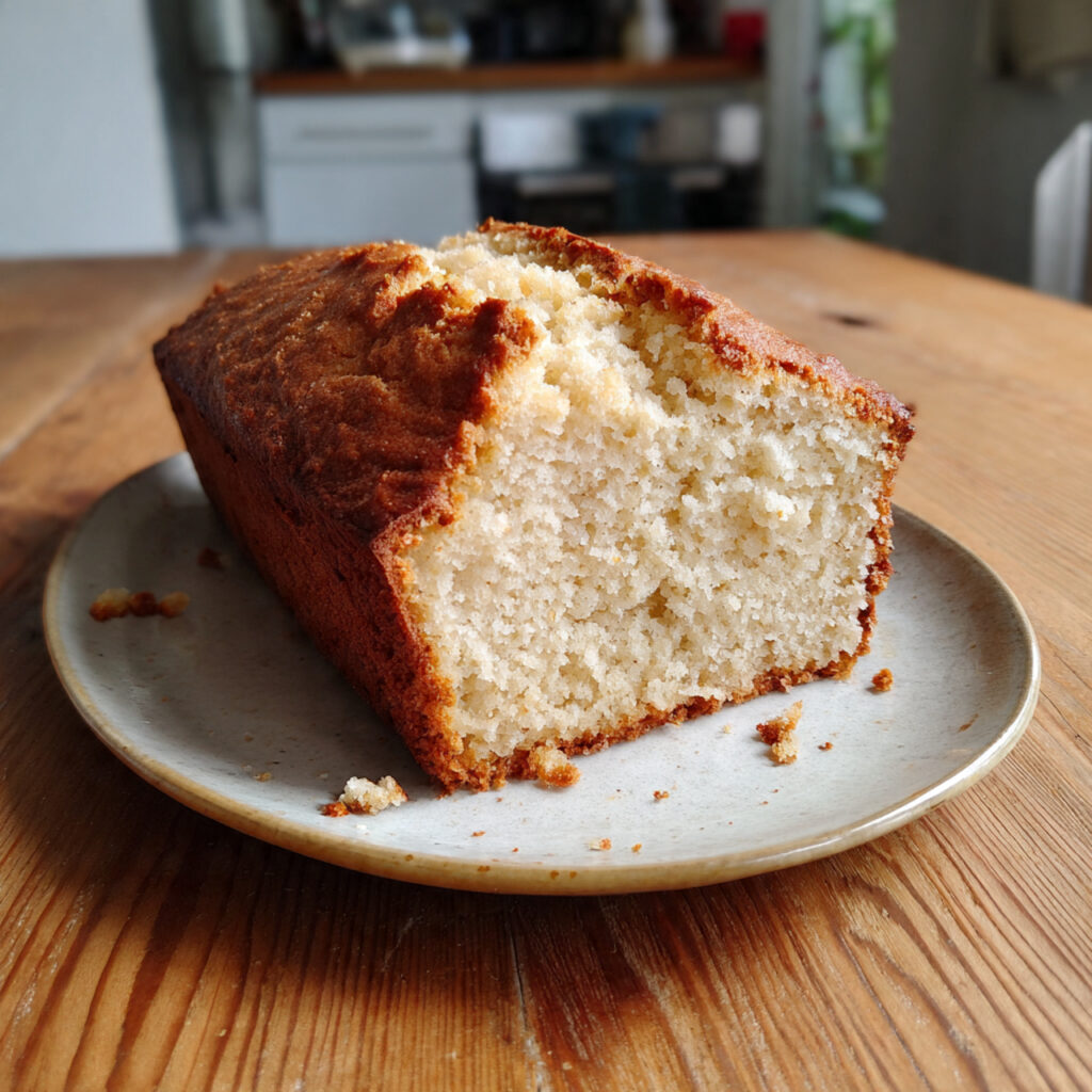 Auf dem Bild ist ein angeschnittener Kastenkuchen zu sehen, der auf einem schlichten Teller präsentiert wird. Die Schnittfläche zeigt eine gleichmäßig helle, feinporige Krume mit leicht feuchtem Glanz. Die Kruste ist goldbraun, gleichmäßig gebacken und bildet einen klaren Kontrast zur hellen Innenstruktur. Der Kuchen wirkt kompakt, aber keinesfalls trocken oder schwer.