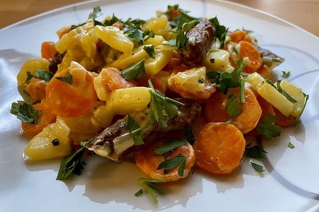 Optisch wirkt die Möhrenpfanne weich, saftig und gleichmäßig gegart. Die Möhren sind in gleichmäßige Scheiben geschnitten, was ein angenehmes Mundgefühl erzeugt. Die Kartoffelstücke sind klein, rundlich und vollständig weich, ohne zu zerfallen. Kleine grüne Gemüsestücke setzen dezente Farbakzente, ohne dominant zu sein.
