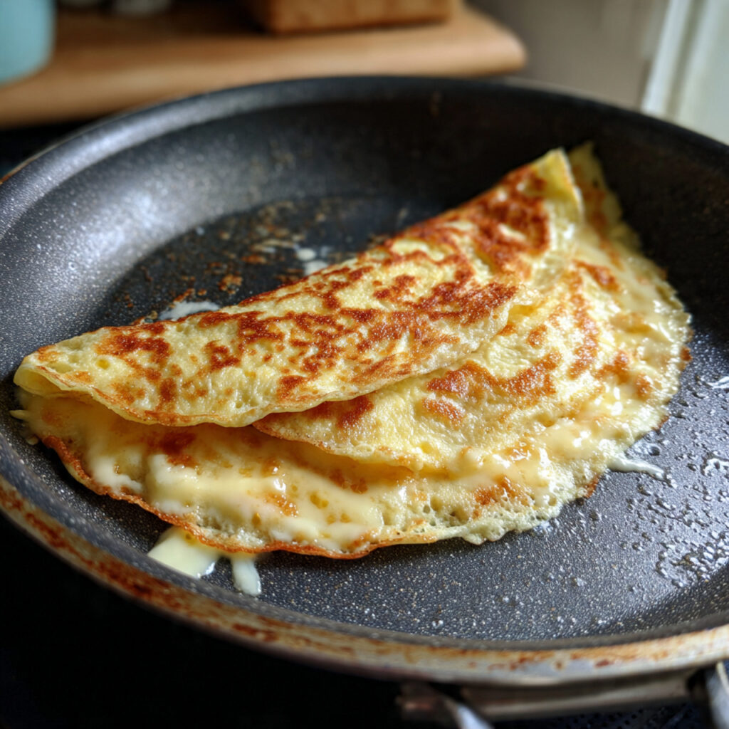 Omas deutsche Käseomelette zeichnet sich durch eine cremige Konsistenz im Inneren und eine leicht gebräunte Oberfläche aus. Der geschmolzene Käse verbindet sich mit den Eiern zu einer aromatischen, zarten Füllung, während die äußere Schicht eine leichte Röstung entwickelt. Das Bild zeigt genau dieses Zusammenspiel aus goldbrauner Oberfläche und weichem, geschmolzenem Käsekern.
