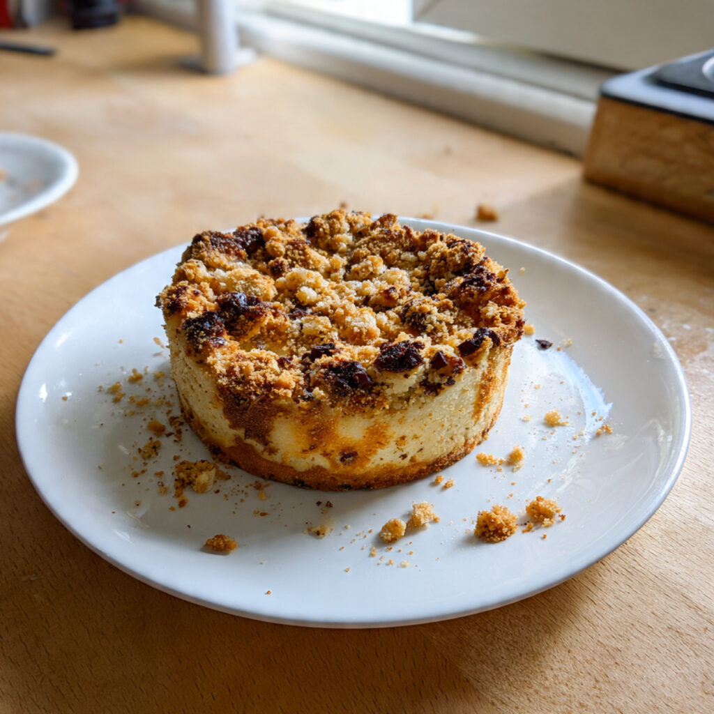 Auf dem Foto ist ein kleiner, runder Streuselkuchen auf einem weißen Teller zu sehen. Der Kuchen besitzt eine dicke, goldbraune Streuselschicht, deren Struktur aus unterschiedlich großen Streuselstücken besteht. Einige Streusel sind dunkler gebacken, was auf eine leichte Karamellisierung der Butter-Zucker-Mischung hinweist.
