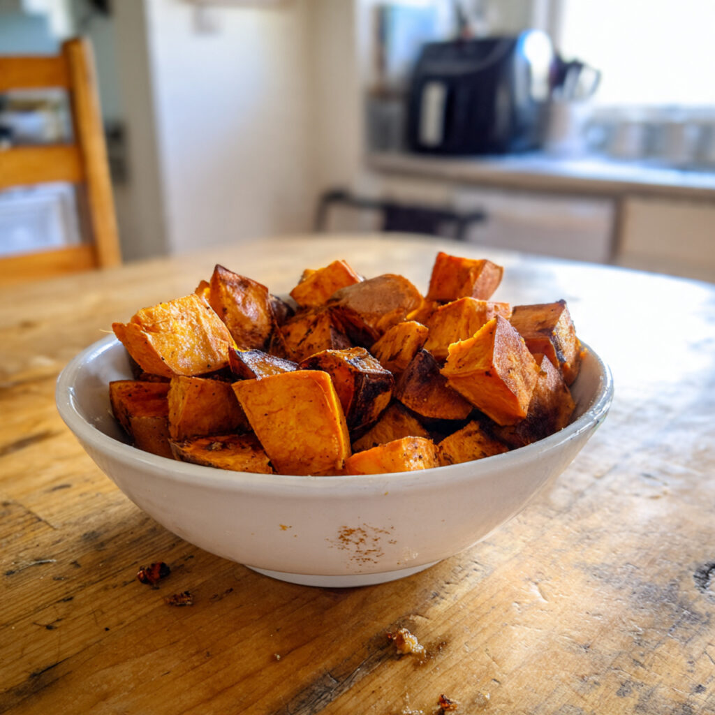 Knusprige Süßkartoffelwürfel aus der Heißluftfritteuse mit aromatischer Würzung und weichem Kern