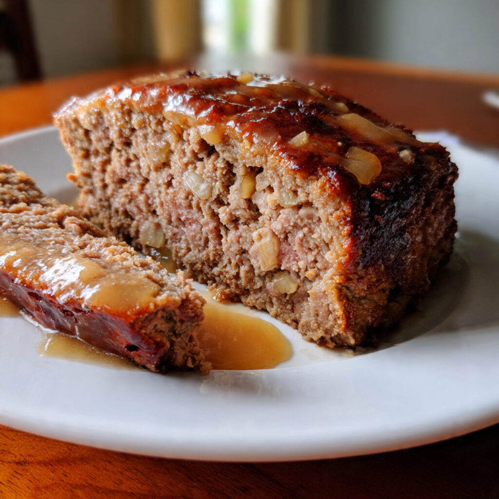 Dieses traditionelle deutsche Hackbratenrezept zeigt sich auf dem Bild in einer besonders klassischen, bodenständigen und zugleich sehr appetitlichen Form. Bereits der erste Eindruck vermittelt genau das, was viele mit einem guten Hackbraten aus der Familienküche verbinden: eine kräftig gebräunte, leicht glänzende Oberfläche, eine saftige, dicht gebackene Krume und sichtbare Zwiebelstücke im Anschnitt, die dem Braten Struktur, Aroma und Authentizität verleihen. Die Scheibe auf dem Teller wirkt kompakt, aber keineswegs trocken. Vielmehr deutet die Textur auf eine sorgfältig abgestimmte Mischung hin, die beim Backen gut zusammenhält, dabei jedoch weich und saftig bleibt. Die helle, leicht braune Sauce auf dem Teller unterstreicht diesen Eindruck zusätzlich und legt nahe, dass der Hackbraten nicht nur als einfaches Ofengericht gedacht ist, sondern als vollwertiges, warmes Hauptgericht mit Bratensaft oder einer milden, hausgemachten Sauce serviert wird.