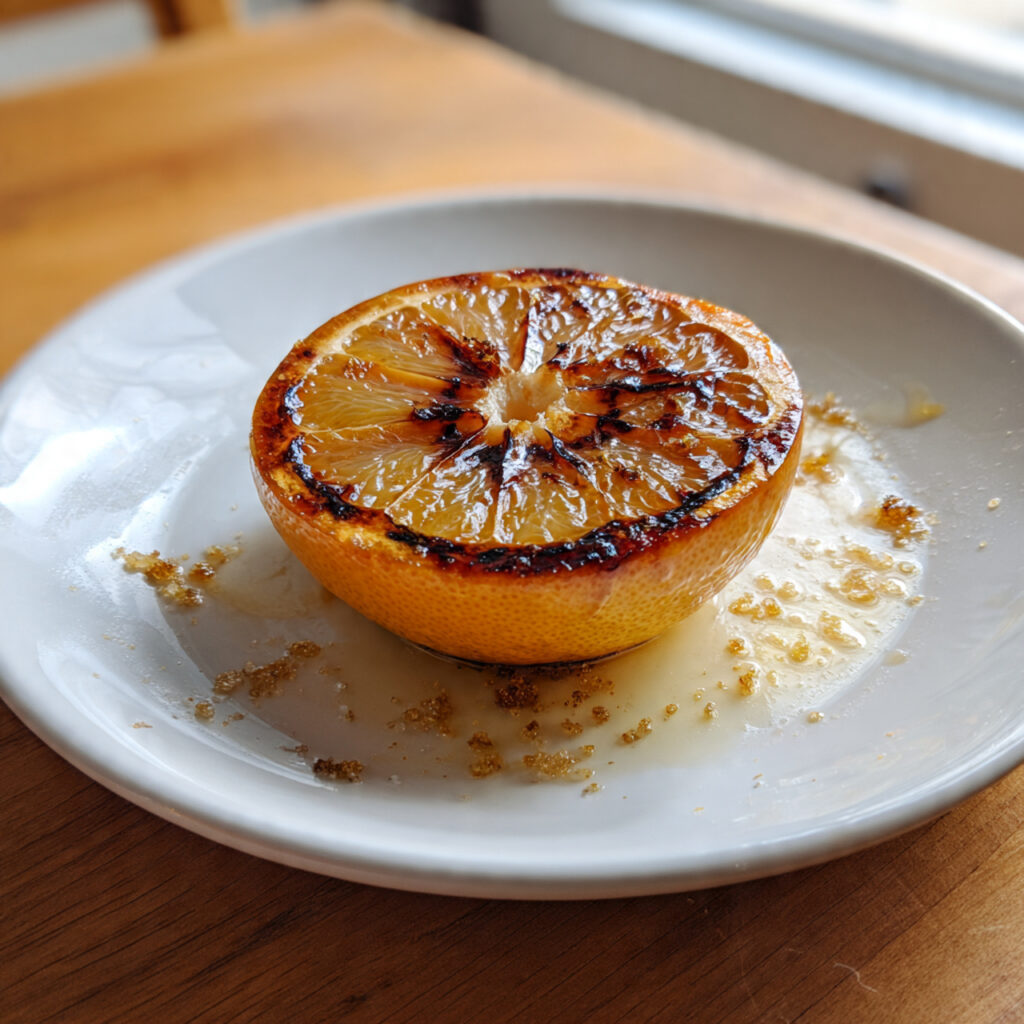 Am Rand der Frucht sind leichte Röstspuren zu sehen, die auf eine kurze, intensive Hitzeeinwirkung schließen lassen. Auf dem Teller befinden sich kleine Zuckerkrümel sowie etwas geschmolzener Fruchtsaft, der sich mit dem karamellisierten Zucker vermischt hat und eine sirupartige Konsistenz bildet. Die Farbe reicht von hellem Bernstein bis zu einem dunkleren Karamellton. Diese Kombination aus natürlicher Fruchtsäure und leicht karamellisierter Süße macht gegrillte Grapefruit zu einem klassischen, aber oft unterschätzten Dessert oder Frühstücksgericht.