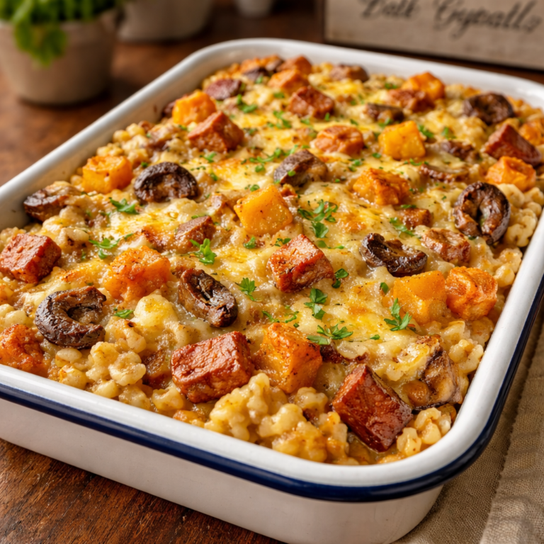 Spätzle-Kassler-Auflauf mit Kürbis & Pilzen